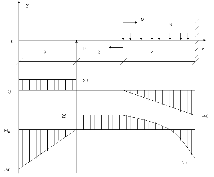 Построить эпюры Q и M для консольной балки при P1=20кН; М1=25кН·м; q1=10кН/м (рис.1) и подобрать диаметр балки круглого