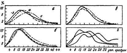 распределения величины скачков взора. Усредненные по пяти операторам данные