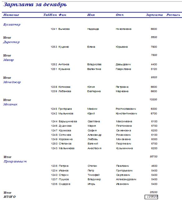 зарплаты и отчет, содержащий фамилии работников и их зарплату, сгруппированные