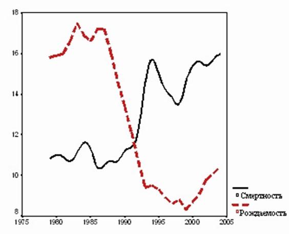 уменьшающейся рождаемости перекрещивается с кривой увеличивающейся смертности.