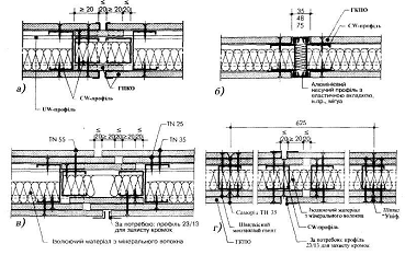 одношаровому обшиванні з встановленням в зоні шва спеціального профілю; в - при