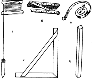 а - схил; би - складаний метр; у - рулетка; г - косинець; д - дерев'яне правило