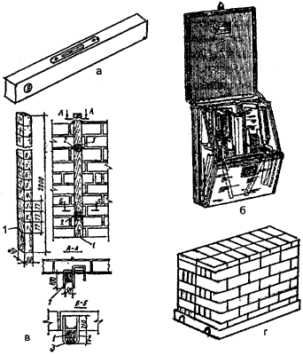 рівень; би - сумка каменяря; у - порядовка і кріплення порядовки до кладки (1 -