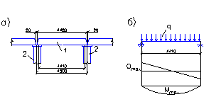 - конструкция узла; б - расчетная схема; 1 - фундаментные болты; 2 - траверсы;