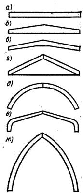 фермы. Их верхний пояс изготовляют из нескольких изогнутых слоев досок, сшитых
