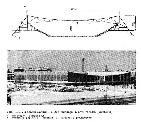 диаметром 94 м. Жесткость покрытия была обеспечена предварительным напряжением