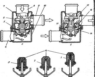 хода; б - при открытии дроссельной заслонки карбюратора; 1 - золотник; 2 -
