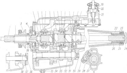 - ведущая шестерня привода спидометра; 28 - ведомая шестерня привода