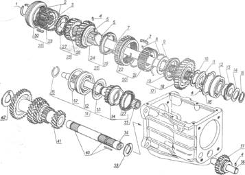 Шестерня первичного вала, а также шестерни I, II и III передач, сидящие на