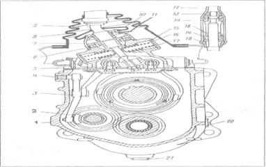 кольцо; 17 - подшипник; 18 - верхняя крышка коробки передач; 19 - колпак; 20 -