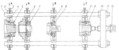 муфты включения I и II передач; 13,15 - упорные шайбы; 14 - шестерня I передачи; 16 - стопорное