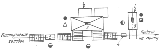 рольганга; 2 — стенд для разборки головки цилиндров; 3 — ванна для выварки