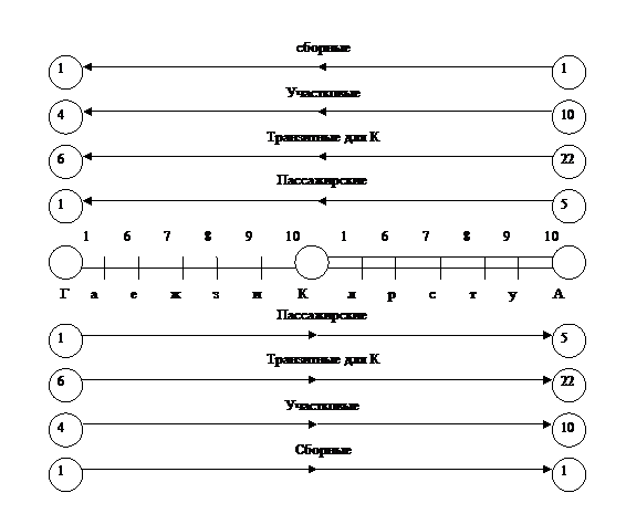 промежуточные станции; 1,6,7 и т.д. - номера перегонов