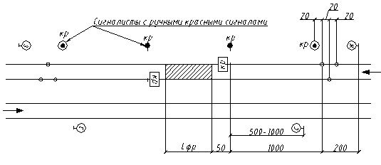 работ на расстоянии 50 м переносными сигналами «Начало опасного места» и «Конец