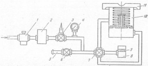 прижим; 6 – втулка направляющая; 7 – кран; 8 – манометр; 9 – прокладка
