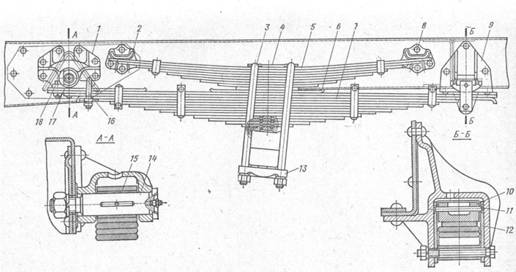 крышка; 7 – листовая рессора; 8 – стремяночный болт; 9 – резиновый буфер;; 10 –