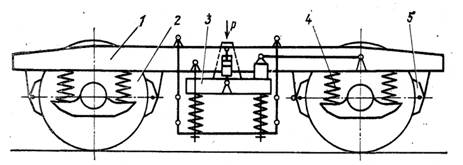 четыре комплекта буксового подвешивания 4 и тормозная рычажная передача 5