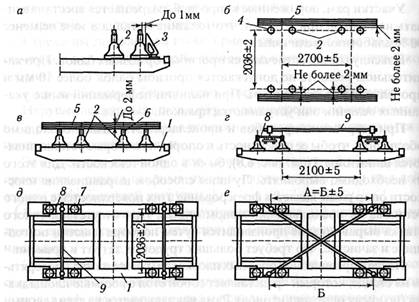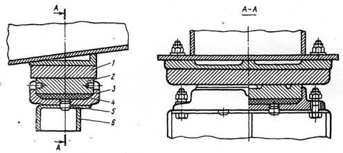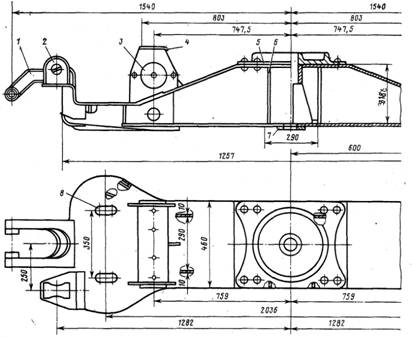 продольных балок имеются усиления из приваренных листов толщиной 14 мм. По концам продольных балок рамы приварены планки 5, служащие для крепления шпинтонов, а