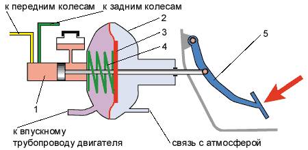 педаль тормоза; 3 - вакуумный усилитель; 4 - главный цилиндр гидропривода