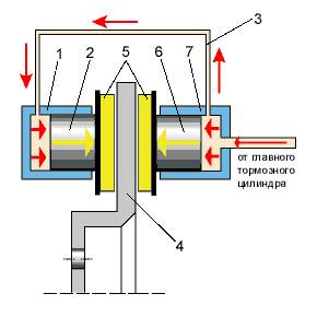 цилиндра; 6 - главный тормозной цилиндр; 7 - поршень главного тормозного