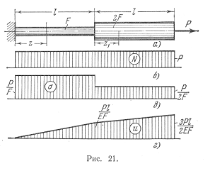 переменной площадью поперечного сечения (рис. 19, а) напряжения меняются