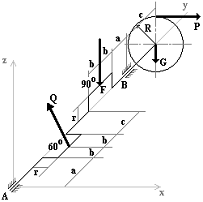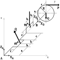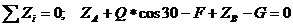 3) ∑FKZ=ZA+ZB+RC·sin30°-G-Q·cos45°=0;