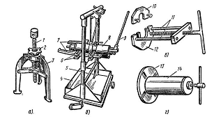 гвинтовий знімач з регульованим розкриттям тяг, б - гідравлічний знімач, в -