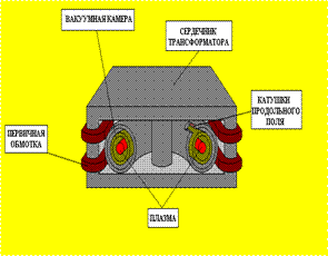 ионизированный газ, заключён между полюсами сильного электромагнита, который