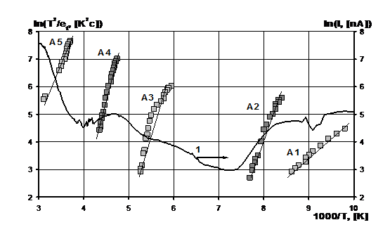 большую величину, в то время как термостимулированная проводимость вблизи 120 К