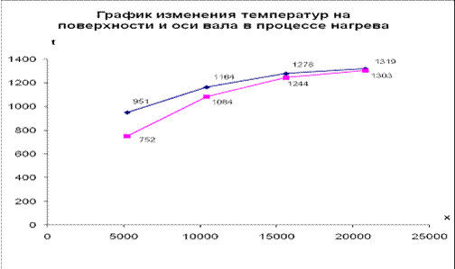 в масштабе график изменения температур на поверхности и оси вала в процессе