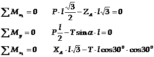 составляем три уравнения равновесия в проекциях на оси координат x, y и z и