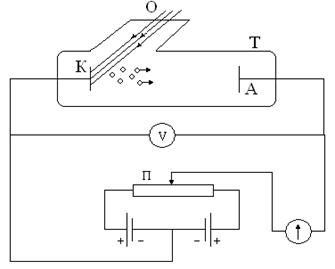 розміщені у вакуумній трубці Т. Напруга між ними змінюється за допомогою