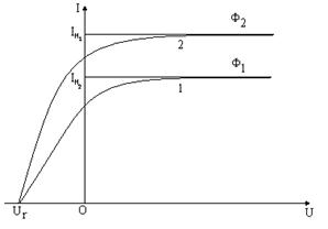 світловому потоку Ф, що падає на катод (рис.2), криві (1,2); гальмівна напруга