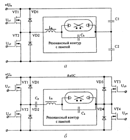Полумостовая (а) и мостовая (б) схемы инвертора напряжения