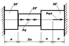 сжимает среднюю часть стержня, затем как сосредоточенная сила 2q×2a сжимает левую часть. Реакция левой заделки R не влияет на деформацию стержня. Таким образом, имеем: