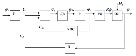 з електродвигуна (Дв) 3 і редуктори (Р) 4. Вхідний сигнал для електродвигуна -