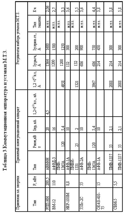 коммутационной аппаратуры и уставок максимальной токовой защиты сведём в