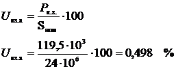 =119 кВт, потерями холостого хода Рхх=18.5 кВт, напряжением короткого