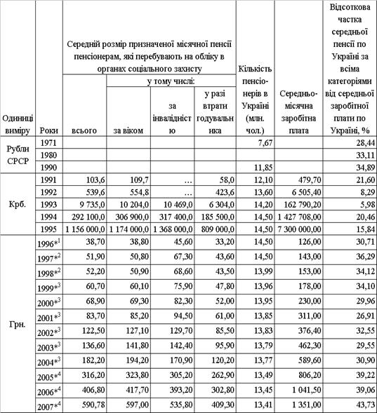 пенсіонерів, середній розмір пенсії та заробітної плати в Україні у 1971 – 2007