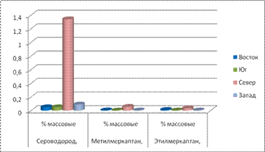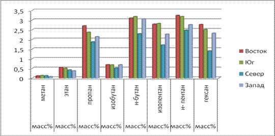 1,32% масс, а наименьшее – на юге (0,05% масс). Углеводородами наиболее