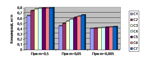 часу. Зі зменшенням частки забруднених атмосферних опадів, що інфільтруються (m=0,05), концентрація ЗР у ГВ через