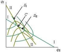 сочетания qI,qII, соответствующие отраслевому равновесию в моделях Курно и Штекельберга