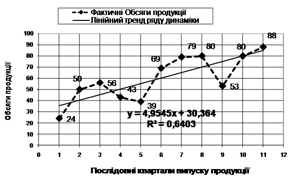 обсягів випуску продукції та лінійна регресійна модель ряду, розрахована