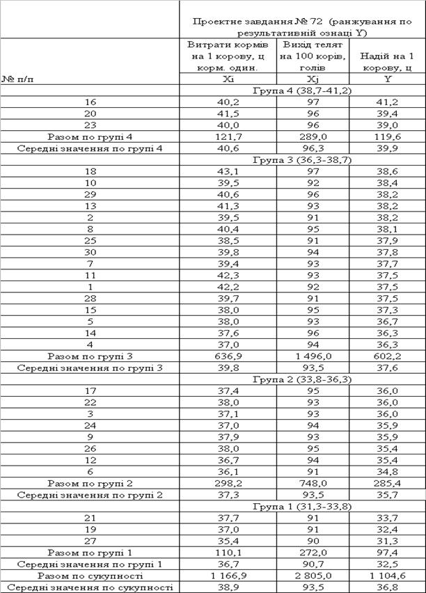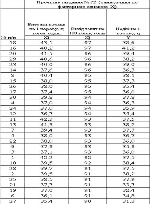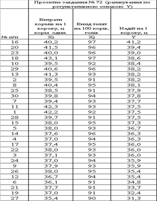 є умовна вибірка показників продуктивності ВРХ по варіанту №72.