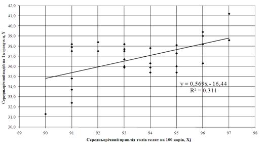 корів, при цьому коефіцієнт детермінації R2 для лінійної кореляції