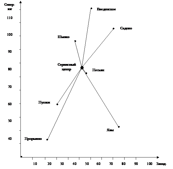 Рис.4. Размещение сервисного центра и потребителей его услуг