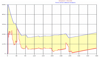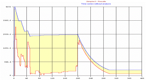 красная - остатки на складе, после совершения покупок клиентами, а область