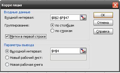 данных выберите инструмент Корреляция, а затем щелкнуть на кнопке ОК.