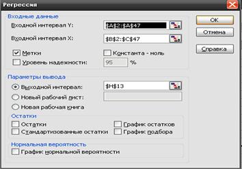 данных. В диалоговом окне выберем инструмент Регрессия, а затем ОК. В поле