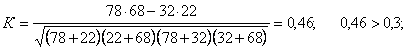 досить високими значеннями коефіцієнтів асоціації і контингенції.